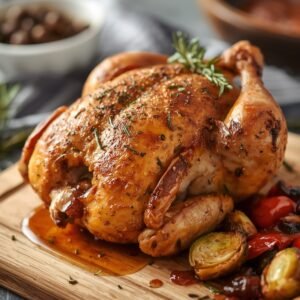• Seasoning: In a bowl, mix together the olive oil, salt, pepper, paprika, garlic powder, onion powder, and your dried herbs. Now, here comes the fun part! Rub this mixture all over the chicken. Don’t hold back! Get inside those crevices and coat it well. Your chicken should be dancing in flavor!